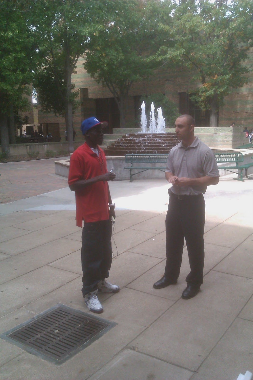 With that excitement over, we got the books and DVDs set up on the table and got to work handing out bottles of water and tracts to the students as they passed by. The ones that appeared to be in not too big of a hurry we would engage in conversation. All four of us were actively engaged in conversations the entire time we were there.